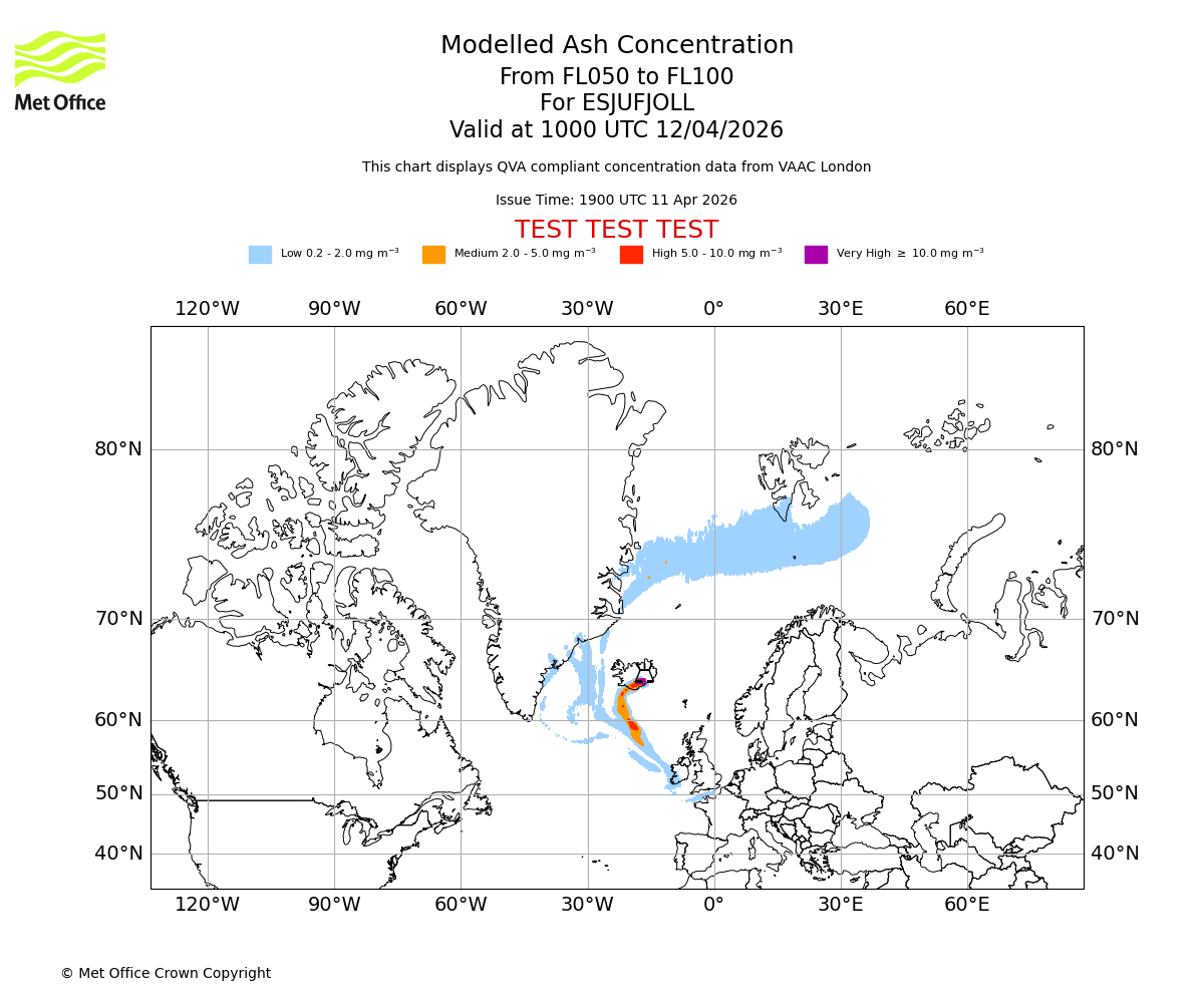 Modelled ash concentration from 000 to 050 for ESJUFJOLL. Valid at 1000 UTC 12/04/2026