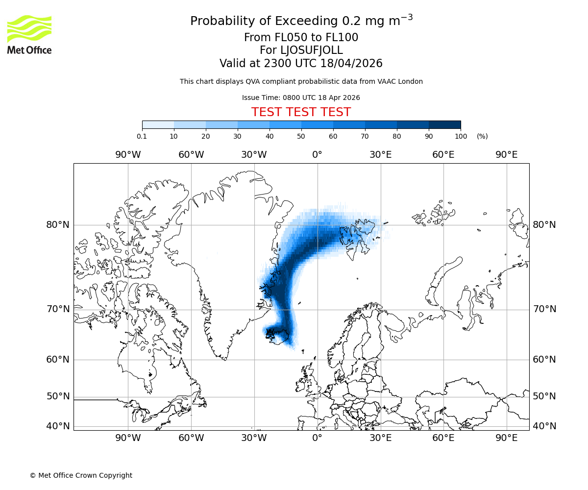 Modelled ash concentration from 000 to 050 for LJOSUFJOLL. Valid at 0800 UTC 18/04/2026