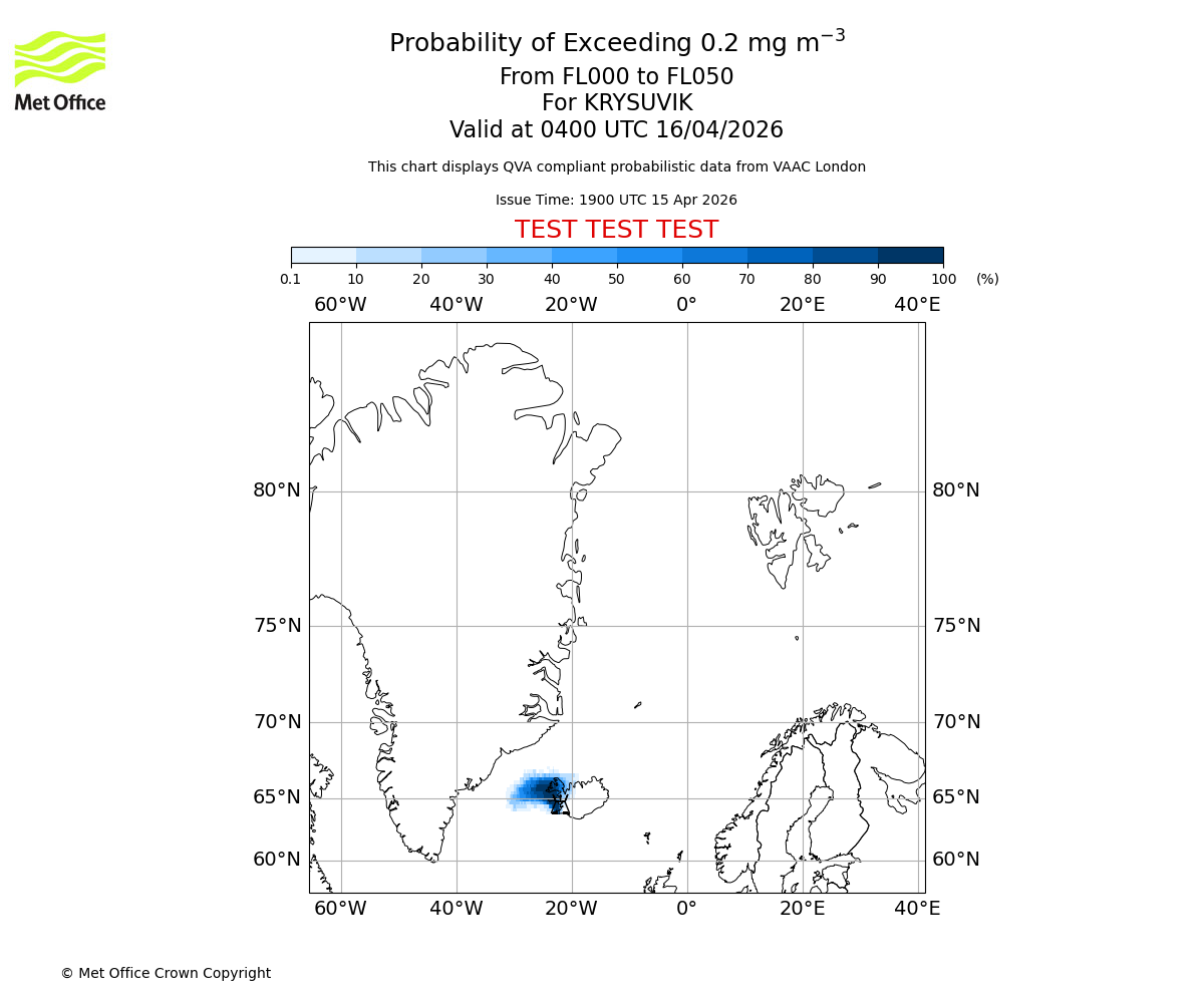 Probability of exceeding 0.2 milligrams per metre cubed. From 000 to 050 for KRYSUVIK. Valid at 0100 UTC 16/04/2026