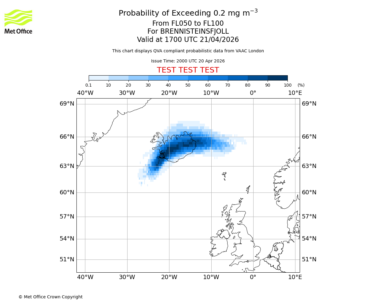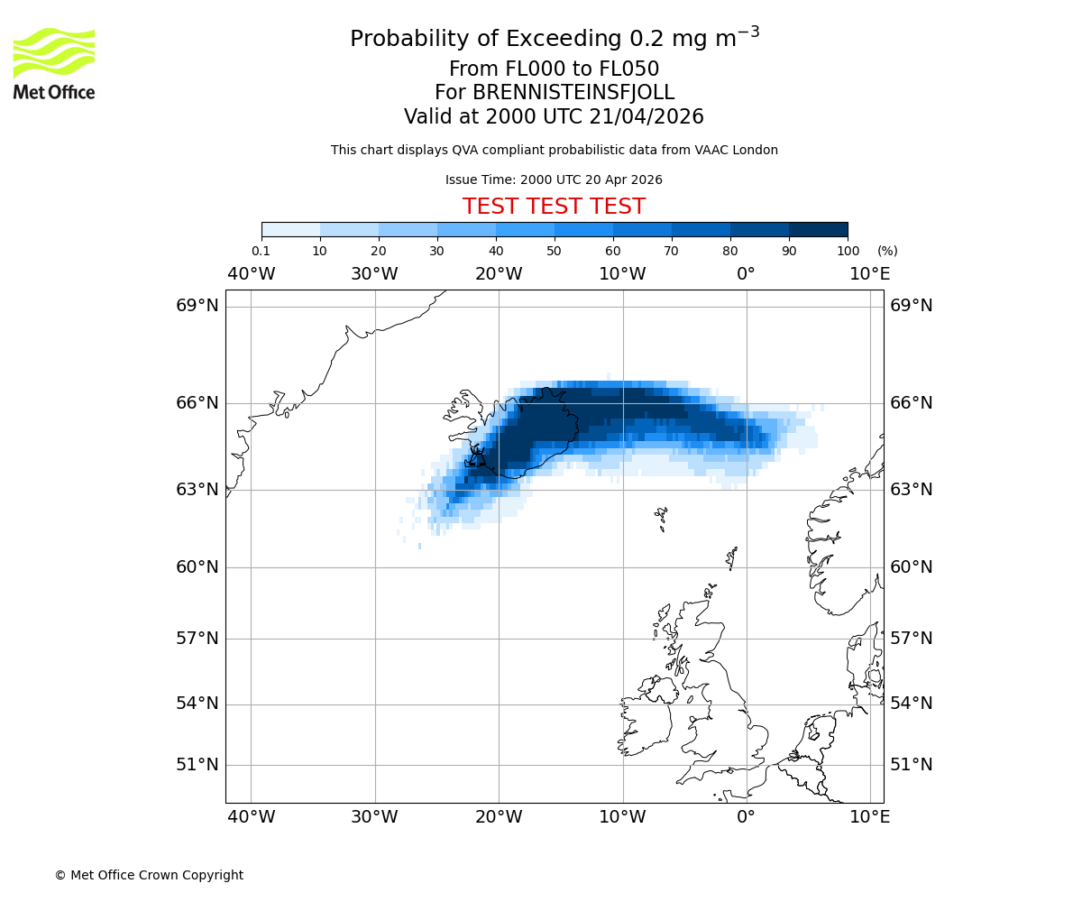 Quantitative Volcanic Ash charts (QVA) are produced in accordance with International Civil Aviation Organization (ICAO) Annex 3 requirements and are provided as well as the London Volcanic Ash Advisory Graphics (VAG) and Advisories (VAA). The lowest QVA threshold (0.2 mg/m³) matches to the areas depicted in the VAA and VAG. Both expected ash concentration and probabilistic forecast information is provided in the chart viewer below for eruptions occurring in the London Volcanic Ash Advisory Centre (VAAC) area of responsibility.