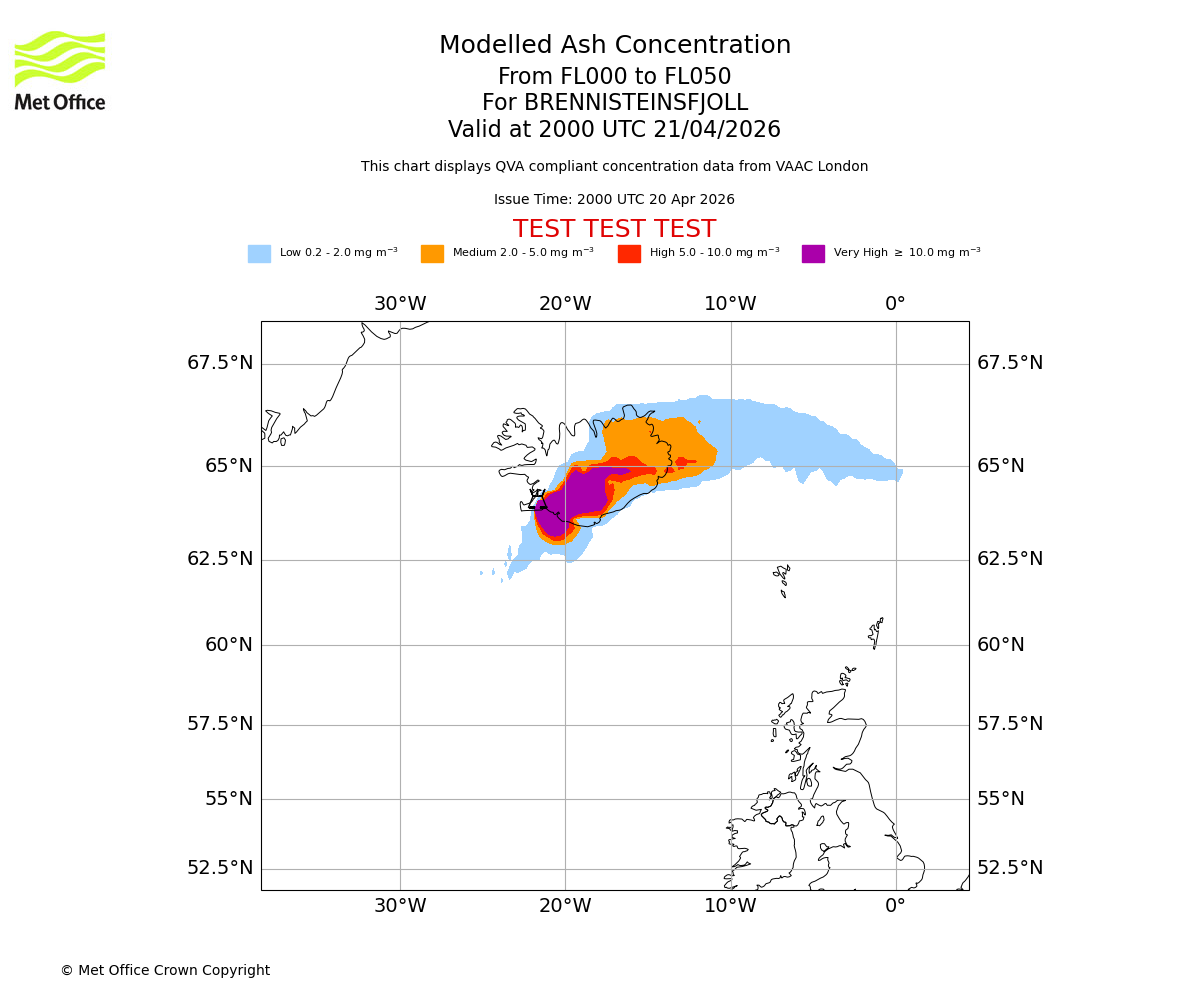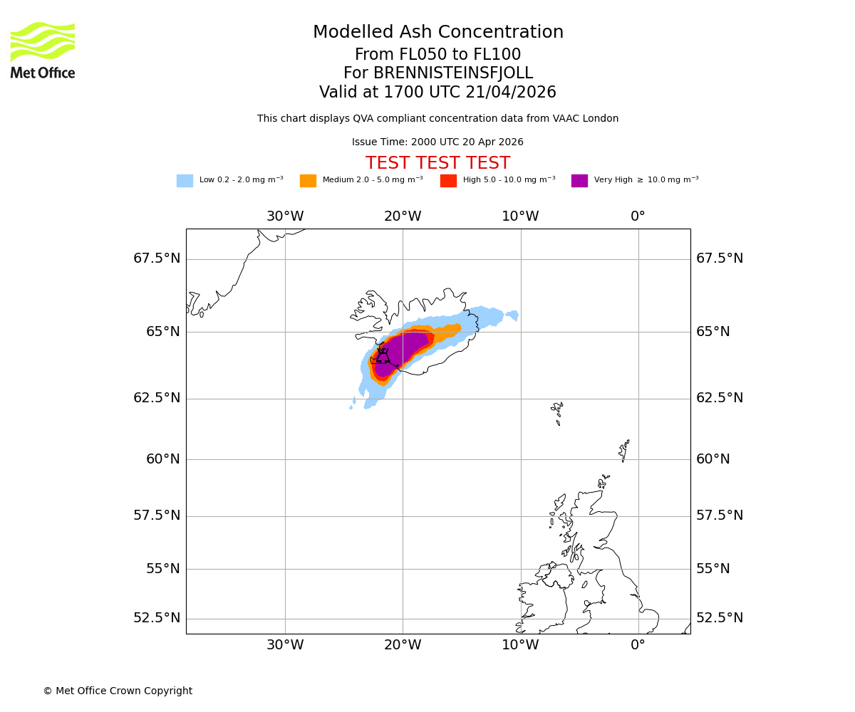 Modelled ash concentration from 000 to 200 for BRENNISTEINSFJOLL. Valid at 2000 UTC 20/04/2026