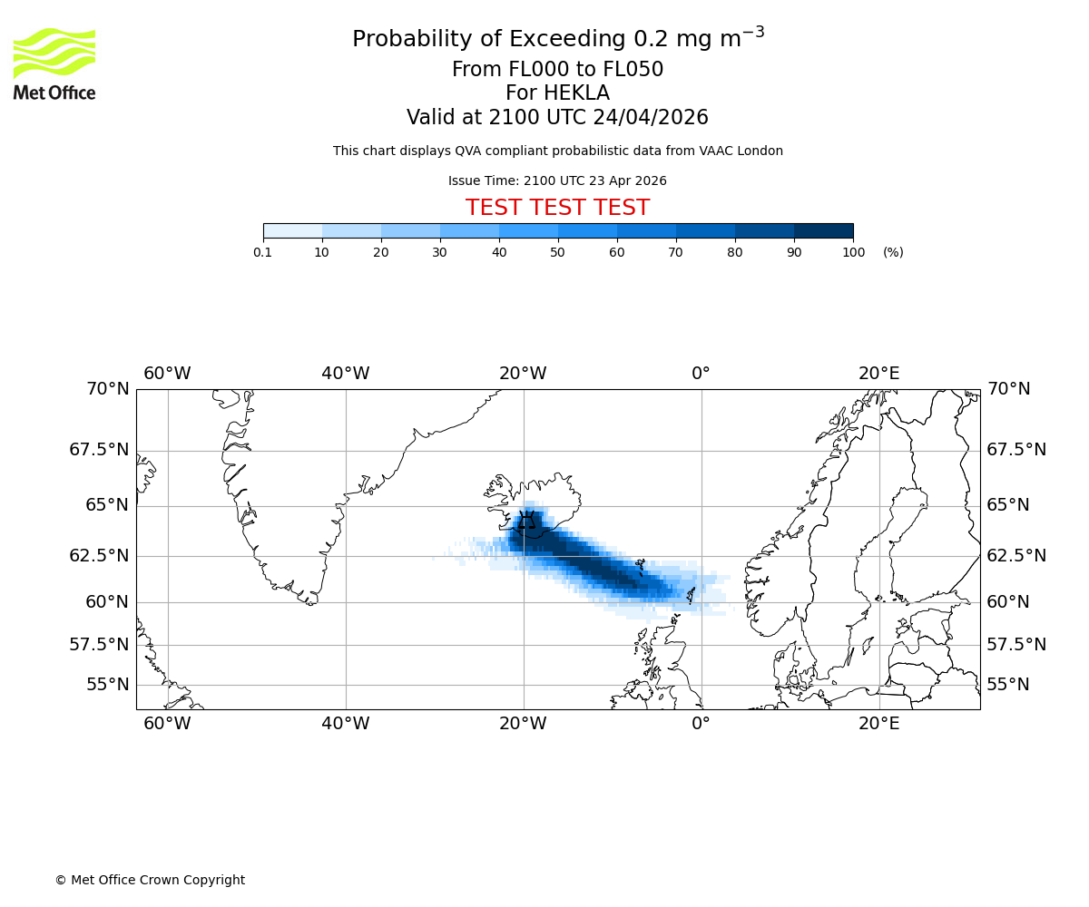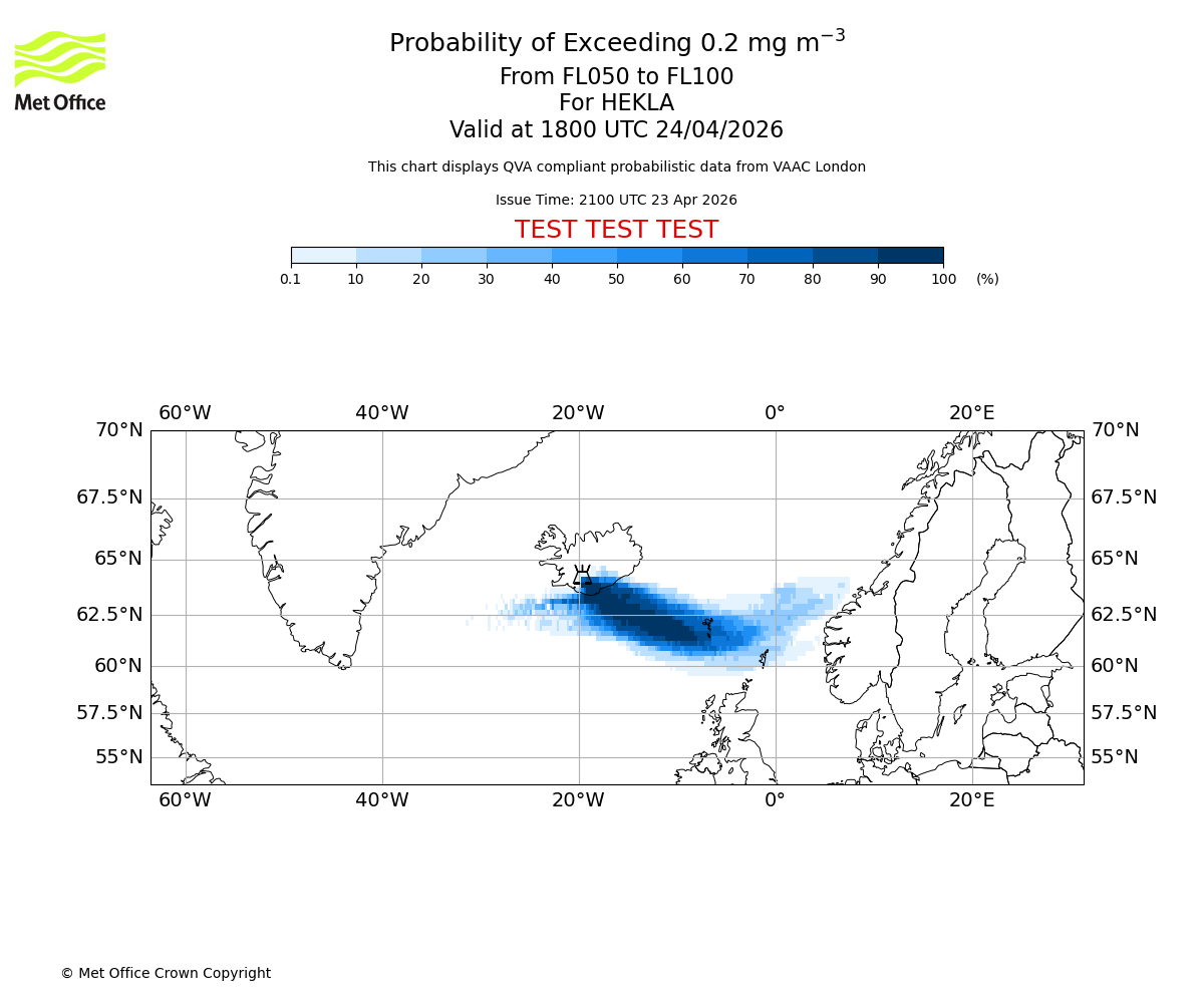 Quantitative Volcanic Ash charts (QVA) are produced in accordance with International Civil Aviation Organization (ICAO) Annex 3 requirements and are provided as well as the London Volcanic Ash Advisory Graphics (VAG) and Advisories (VAA). The lowest QVA threshold (0.2 mg/m³) matches to the areas depicted in the VAA and VAG. Both expected ash concentration and probabilistic forecast information is provided in the chart viewer below for eruptions occurring in the London Volcanic Ash Advisory Centre (VAAC) area of responsibility.