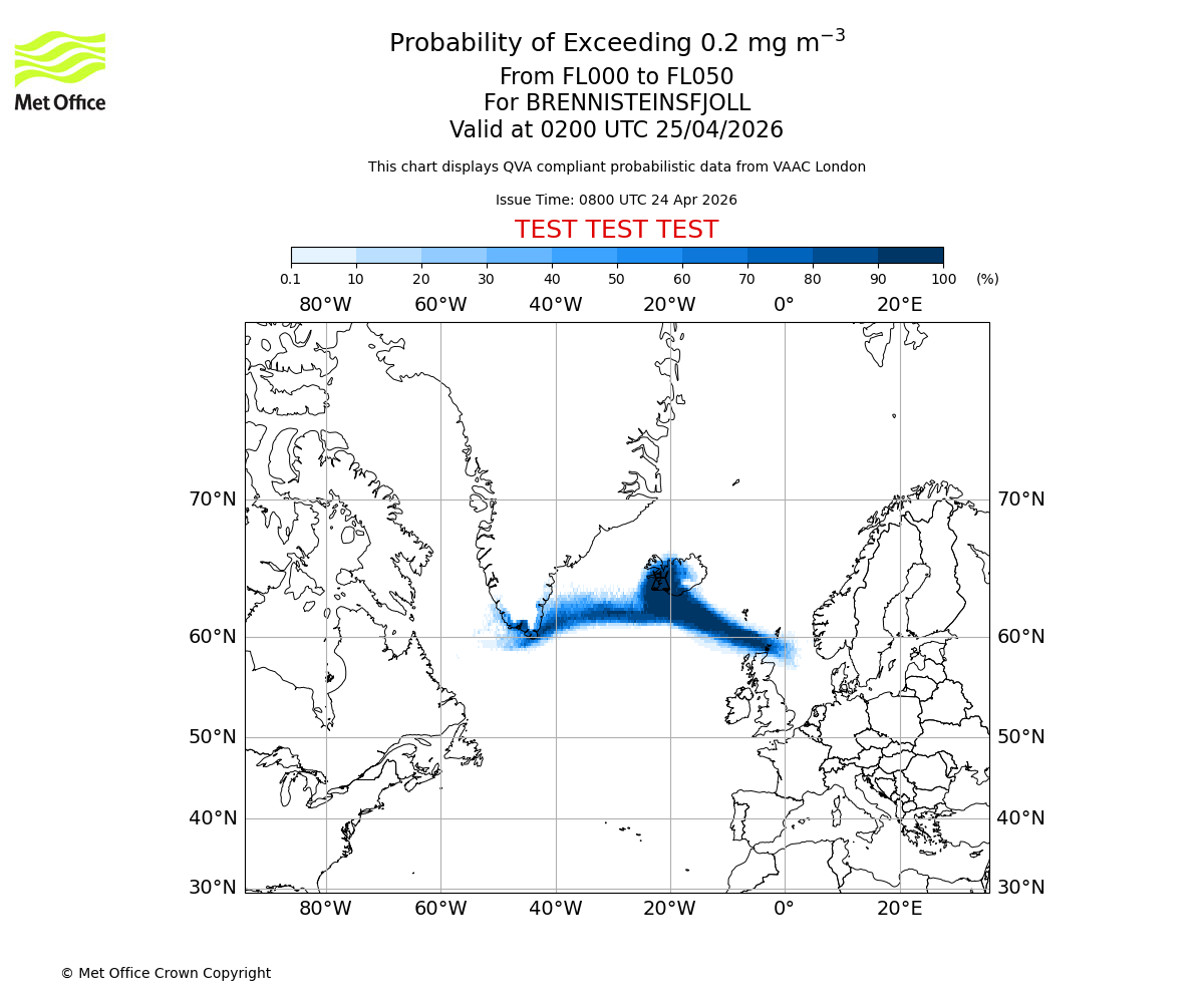 Modelled ash concentration from 000 to 200 for BRENNISTEINSFJOLL. Valid at 0800 UTC 24/04/2026