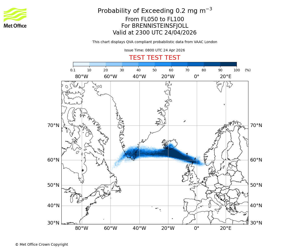 Probability of exceeding 0.2 milligrams per metre cubed. From 000 to 050 for BRENNISTEINSFJOLL. Valid at 2300 UTC 24/04/2026