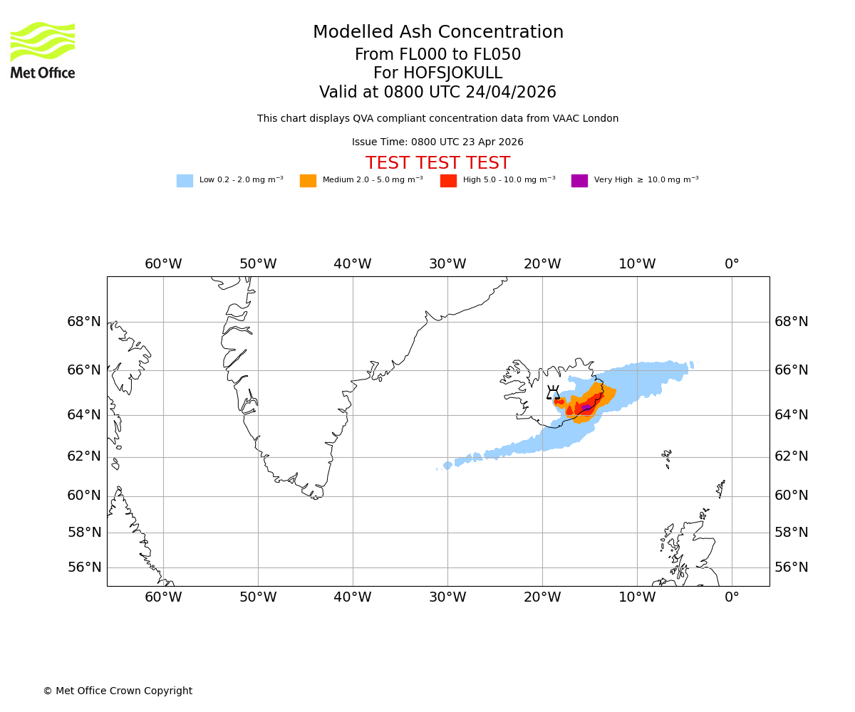 Modelled ash concentration from 000 to 200 for HOFSJOKULL. Valid at 0800 UTC 23/04/2026