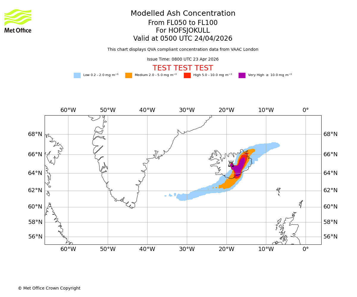 Modelled ash concentration from 000 to 050 for HOFSJOKULL. Valid at 0500 UTC 24/04/2026