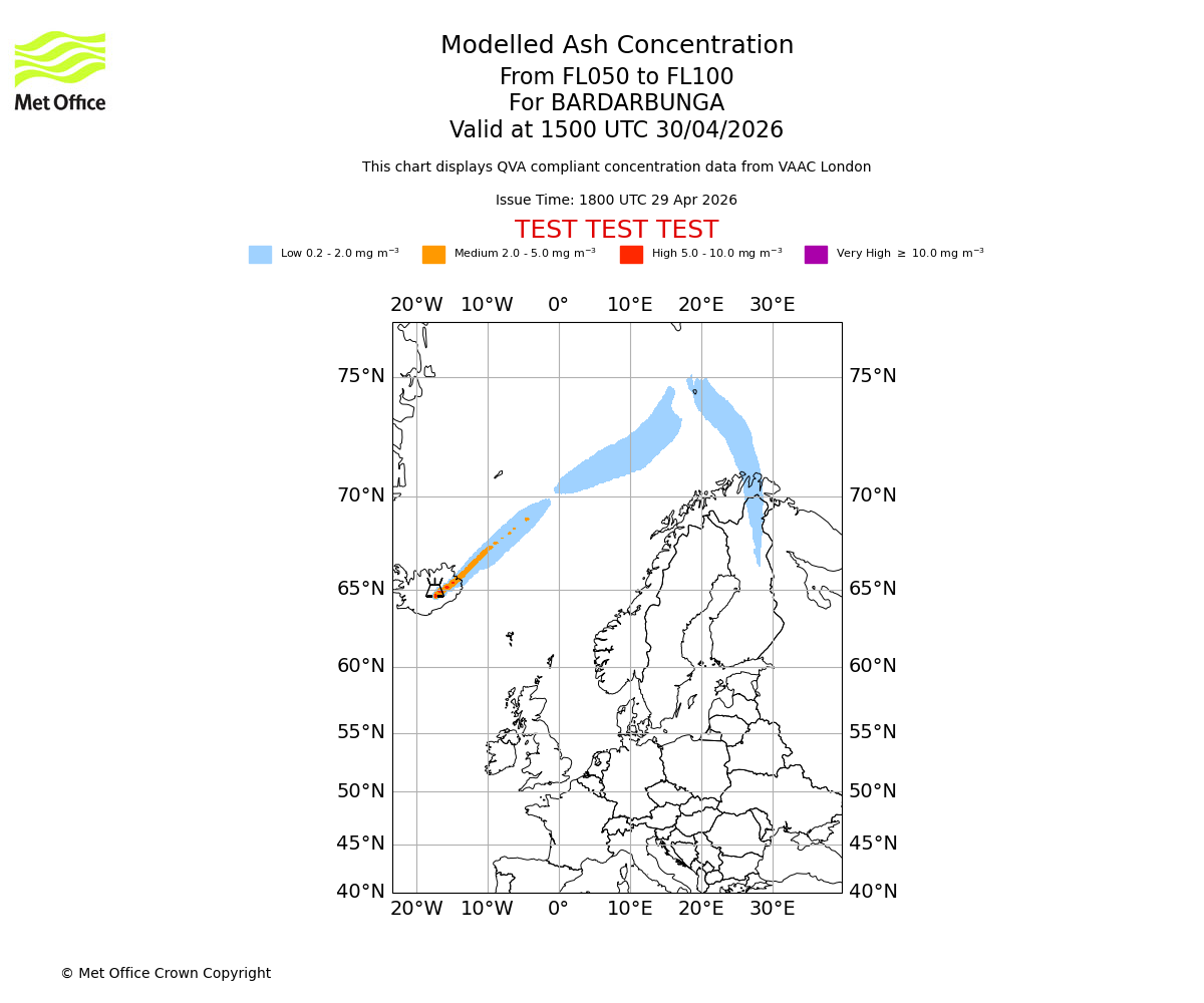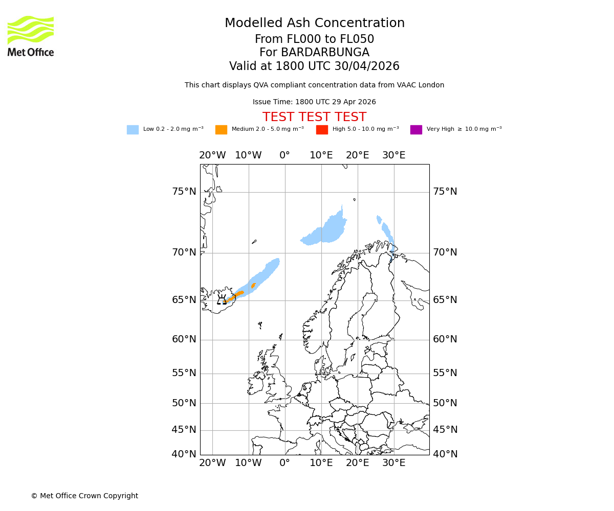 Modelled ash concentration from 000 to 050 for BARDARBUNGA. Valid at 1500 UTC 30/04/2026