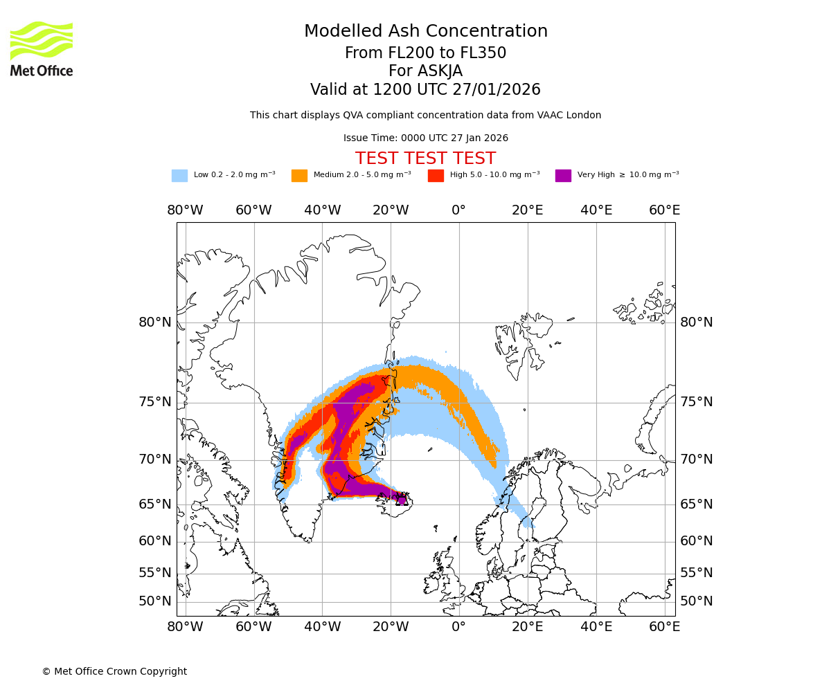 Modelled ash concentration from 000 to 200 for ASKJA. Valid at 1200 UTC 27/01/2026