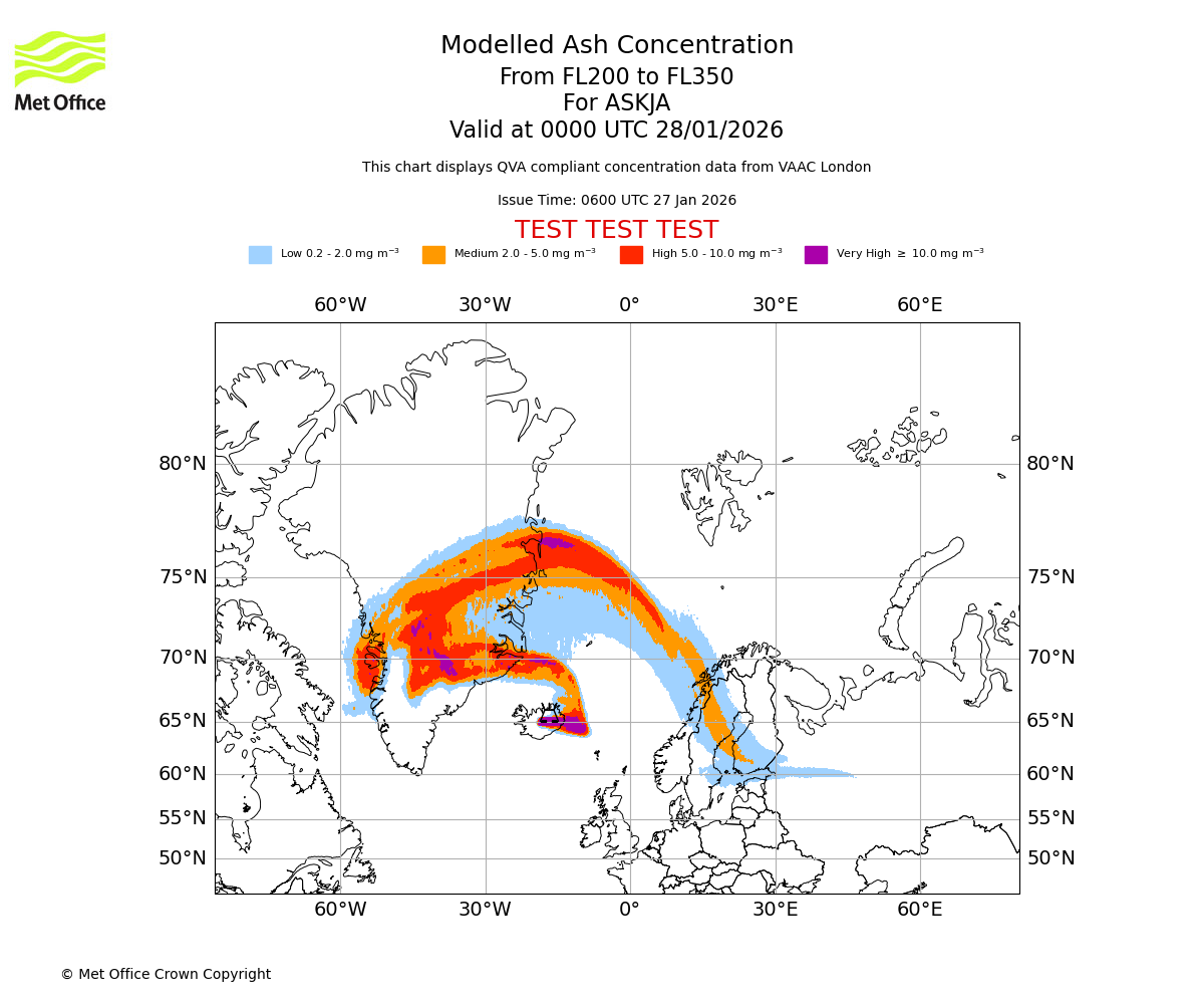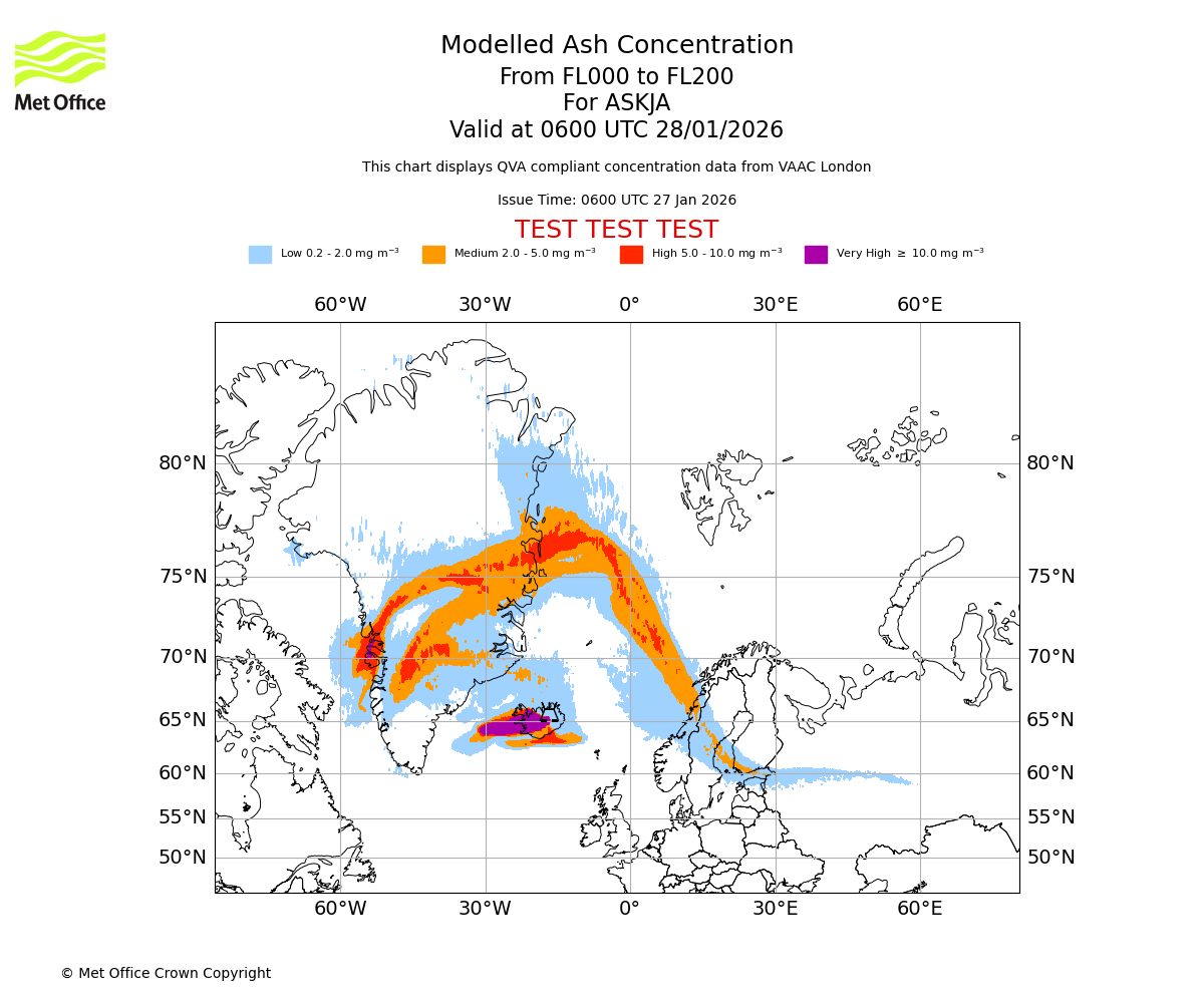 Modelled ash concentration from 000 to 200 for ASKJA. Valid at 0000 UTC 28/01/2026
